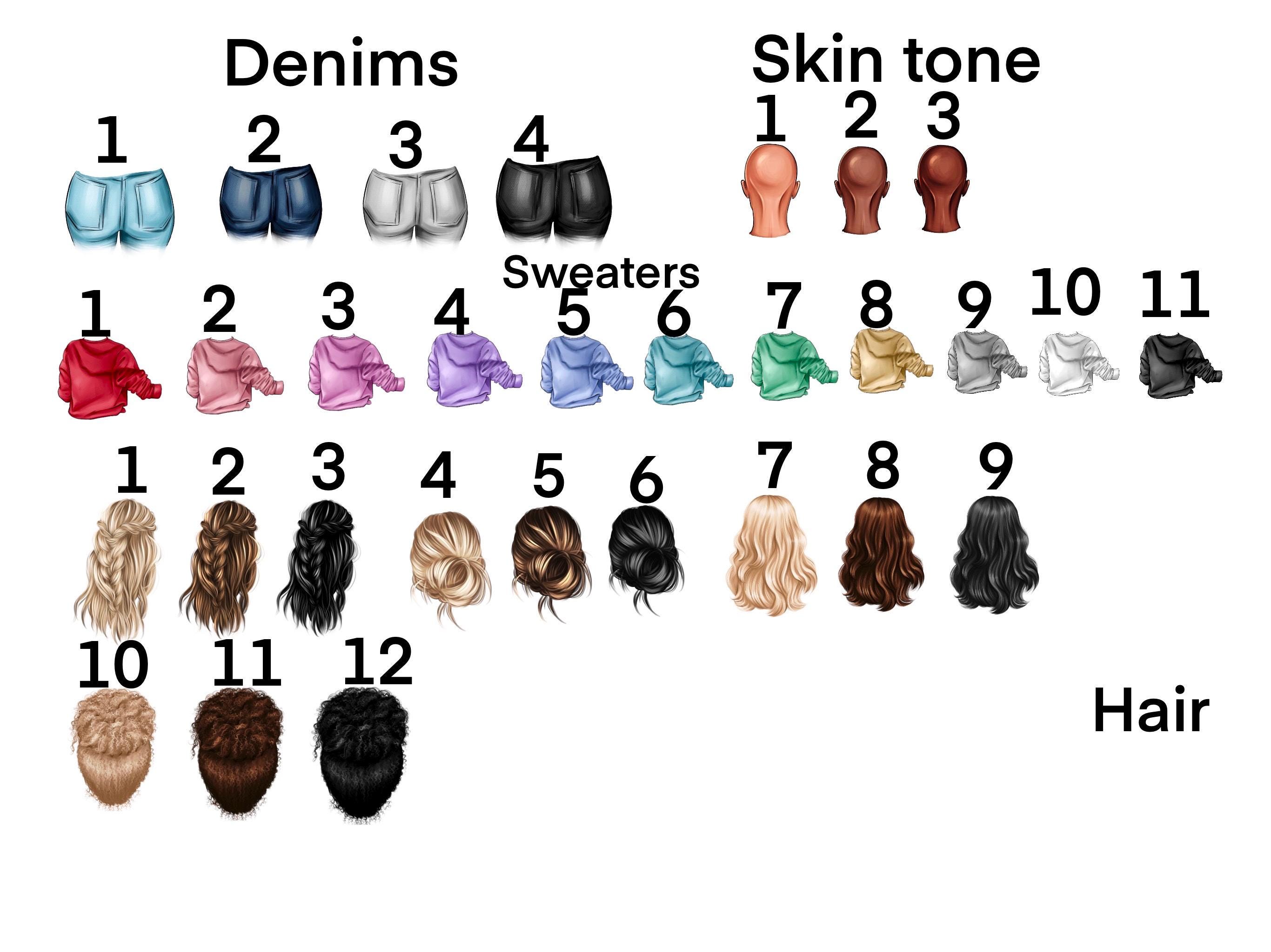 Each part of the character (like hairstyle, outfit, skin tone, etc.) has a number. When you’re personalizing your order, just tell me the numbers for each feature you'd like — it’s like building your own little character!
